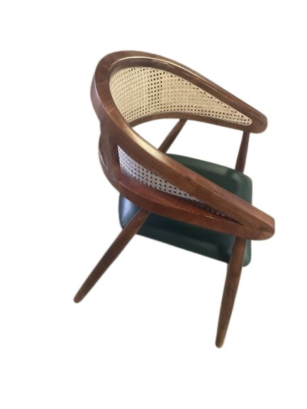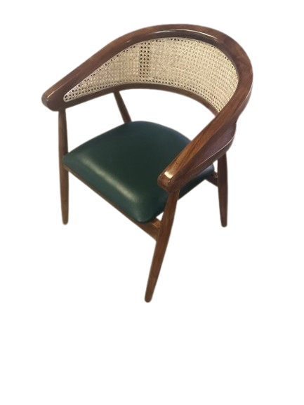 Elevate your interiors with this beautifully handcrafted wooden chair, designed with a curved cane backrest and a premium green leather seat. Made in Jodhpur by skilled artisans, this chair perfectly blends traditional craftsmanship with modern elegance. Ideal for dining rooms, cafes, or living spaces, it offers both style and comfort.
