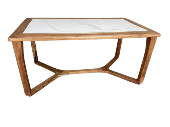 A refined blend of organic charm and contemporary design, this rectangular coffee table features a smooth white marble top with soft veining, framed by solid wood edges. The base showcases an elegant geometric structure with sculpted wooden legs and a unique intersecting support design, enhancing both stability and visual appeal. The warm wood tones contrast beautifully with the cool marble surface, making this table a sophisticated centerpiece for modern living spaces.